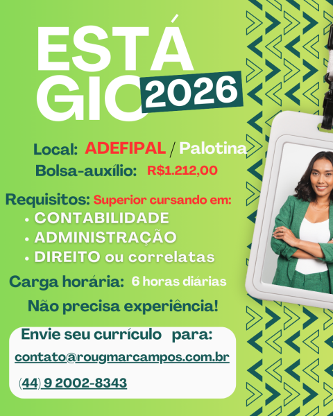 A oportunidade é para estudantes do ensino médio e superior (cursando Contabilidade, Administração, Direito, Psicologia, Serviço Social ou áreas correlatas).